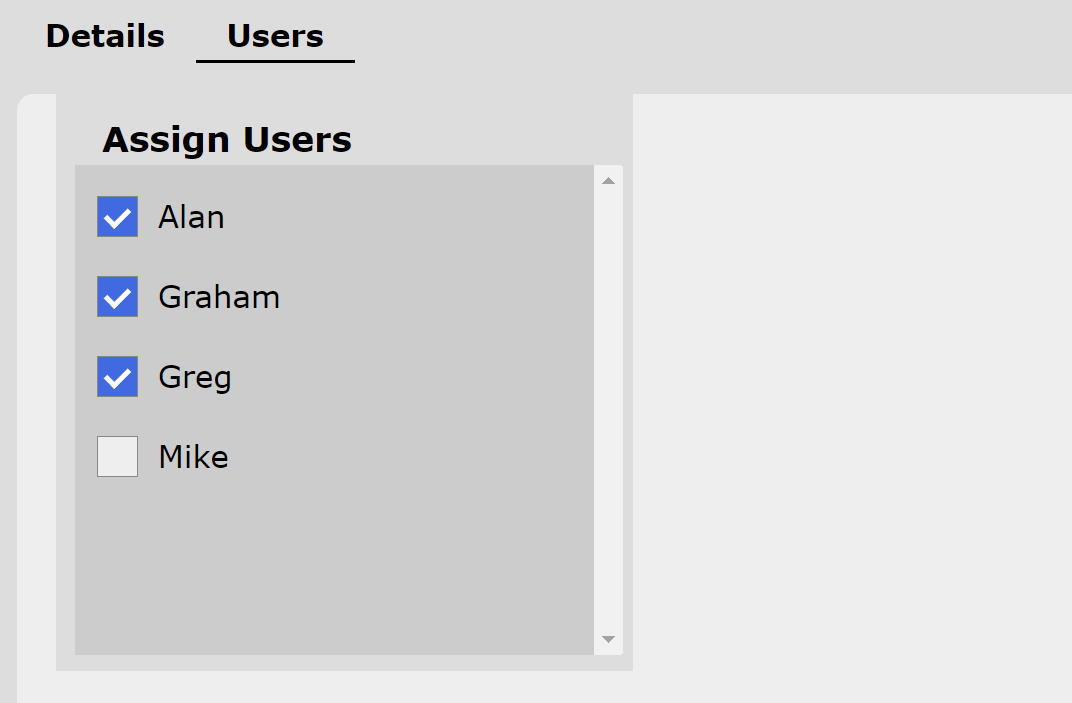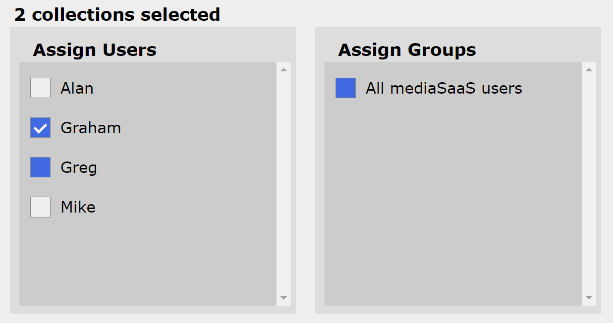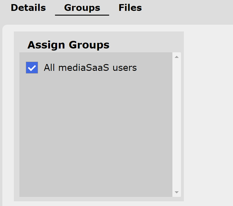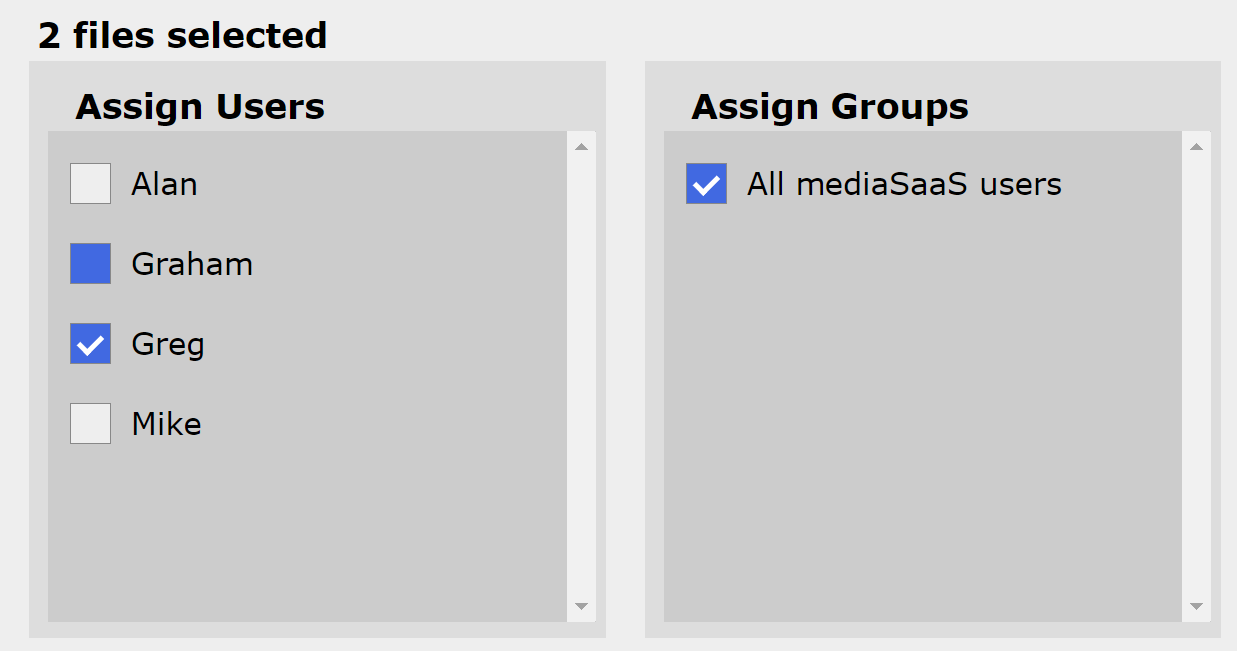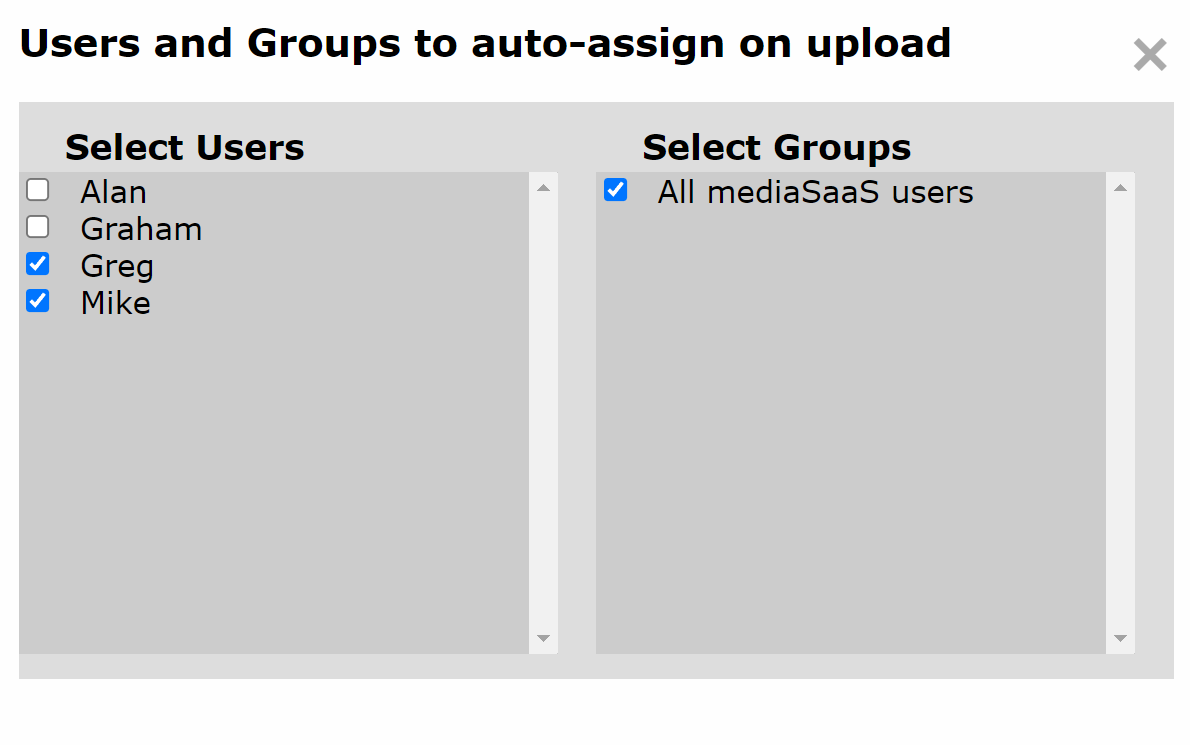 Checking the 'Assign Users on Upload' checkbox will open a dialogue allowing you to choose users and groups that automatically get assigned the newly uploaded files on completion. Close this dialogue once users and groups have been selected. Note that groups of users can only be created by organisation administrators