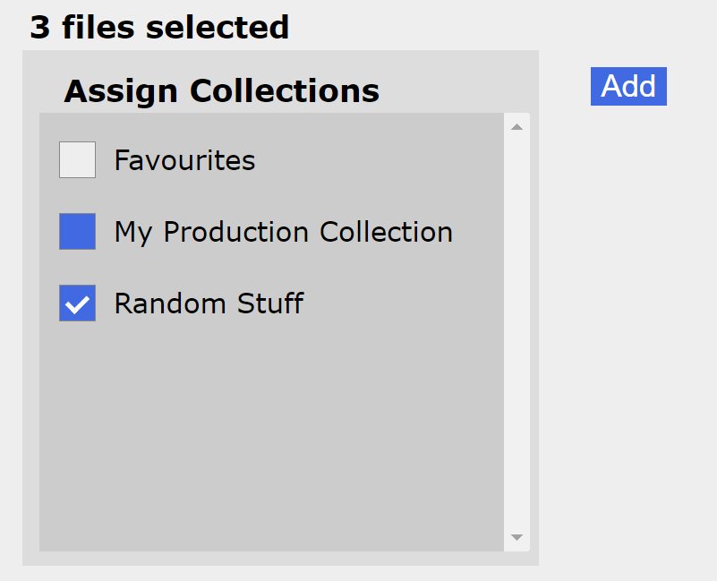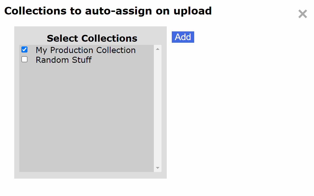 Checking the 'Assign Collections on Upload' checkbox will open a dialogue allowing you to choose collections that automatically get assigned the newly uploaded files on completion. Close this dialogue once colelctions have been selected. You can create a new collection from this dialogue if required by clicking the 'Add' button
