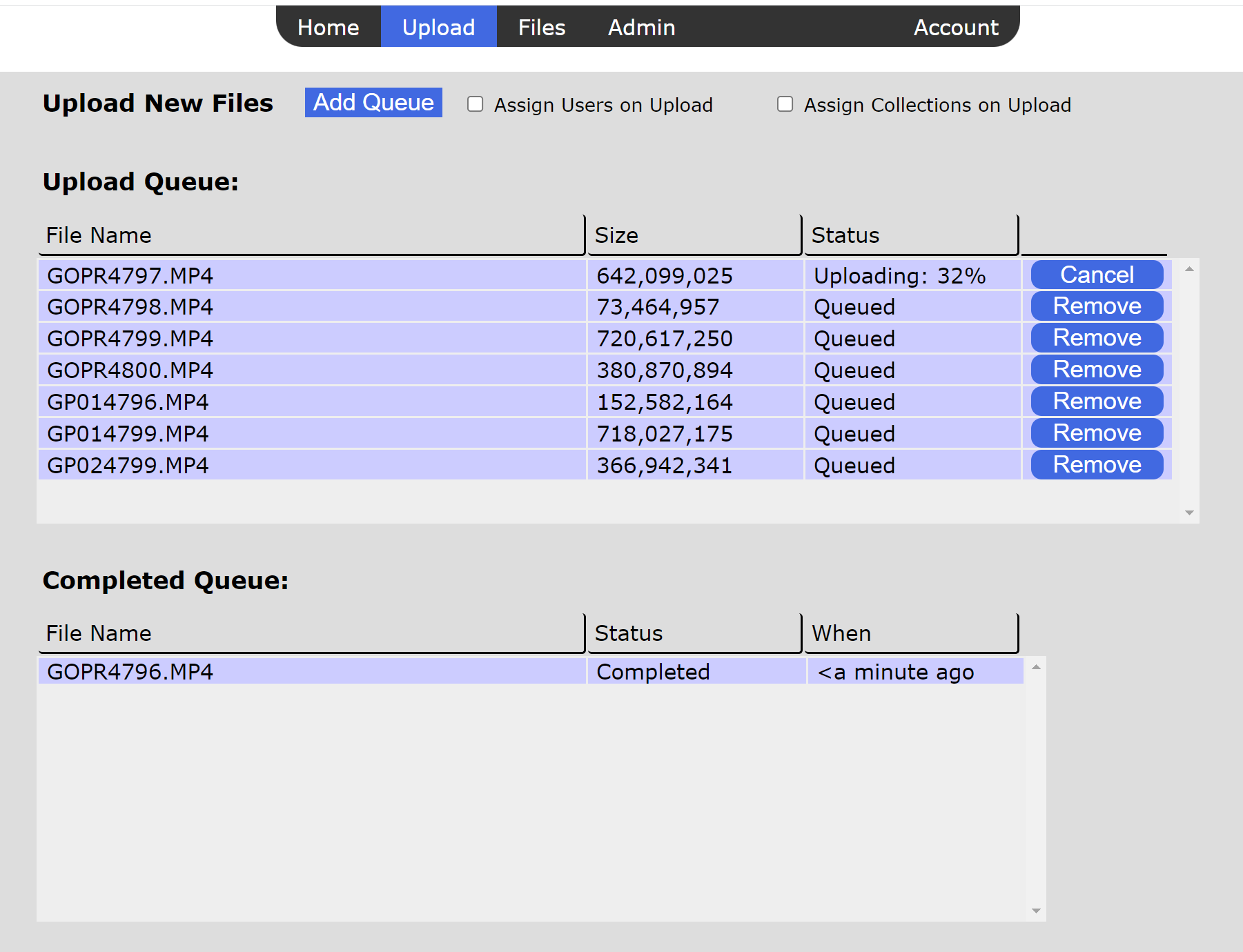 The complete queue will show files that have completed upload in the last five minutes. Clicking on completed files will take you to that file