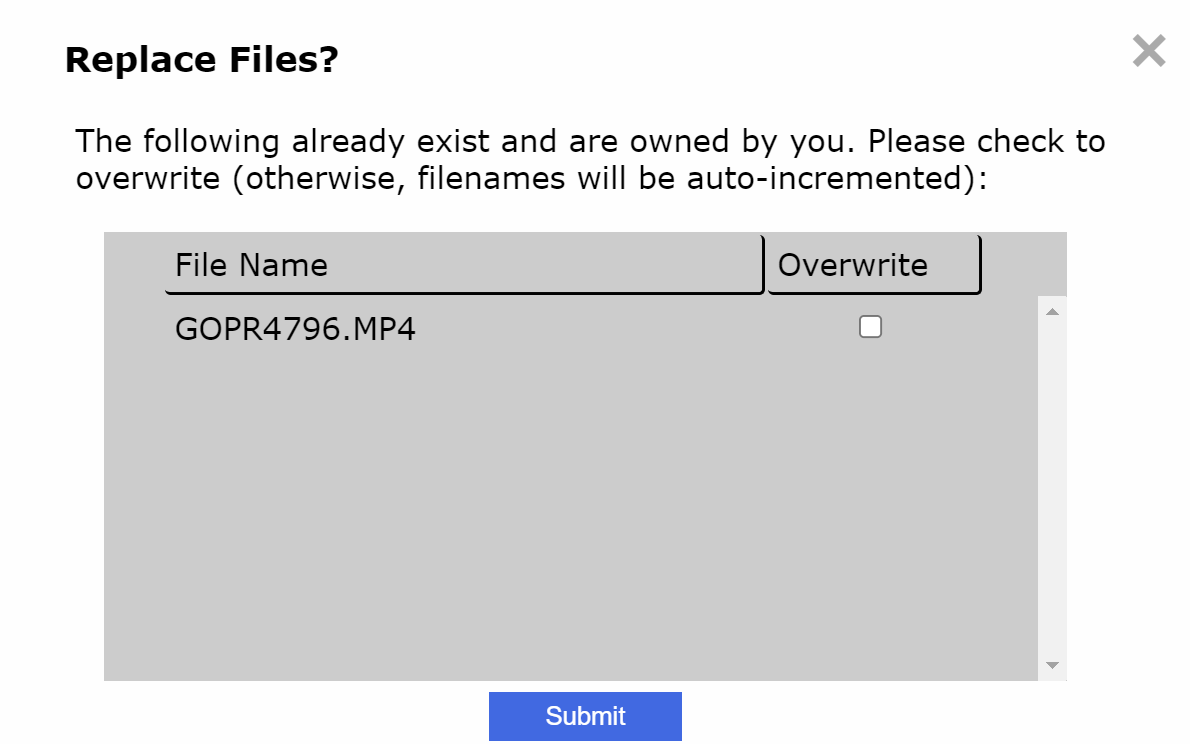 If you have already uploaded a file with the same name, you will be prompted to choose whether the new file is appended with underscore and an incrementing number (e.g. myfile_1.mp4 - defualt option) or replace the existing file (check the overwrite checkbox). Click Submit when you have make a decision for all files.